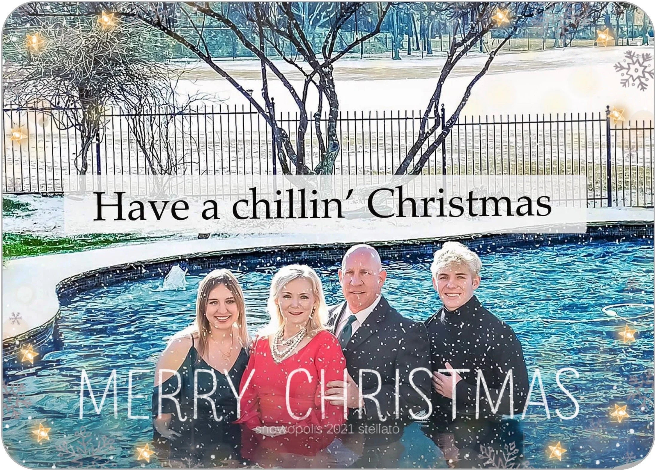 For the record…yes, we are actually in the pool with our nice clothes on in the winter and the water was around 58 degrees. However, it wasn’t actually snowing. We combined an image we took earlier that year during the Texas deep freeze of 2021. We actually think this is a pretty good shot of the family but it was a physical and mental challenge to get in the water.